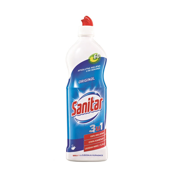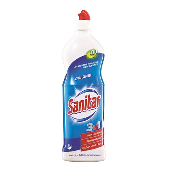 SANITAR ORIGINAL sredstvo za čišćenje i otapanje vodenog kamenca sa pločica, stakla do nehrđajućeg čelika. Uklanja tragove sapuna. Otapa kamenac. Brzo sušenje. Sprečava magljenje. Sjaj bez tragova.